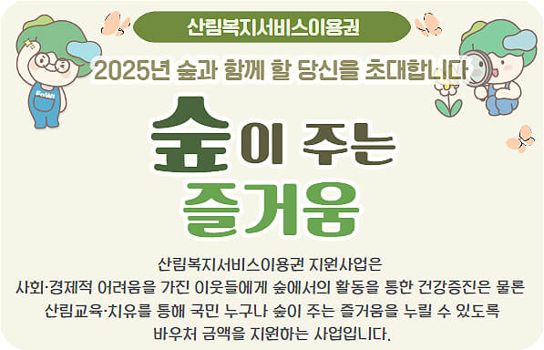 누구나 숲이 주는 즐거움을 누릴 수 있도록 지원해 주는 사업이 있습니다. 바로 산림복지바우처(산림복지서비스이용권)인데요. 지금부터 2025년 산림복지바우처 신청대상 및 신청기간, 신청방법에 대해 알아보도록 하겠습니다. 신청대상에 해당되신다면 신청하셔서 숲이주는 즐거움을 누려보시길 바랍니다.