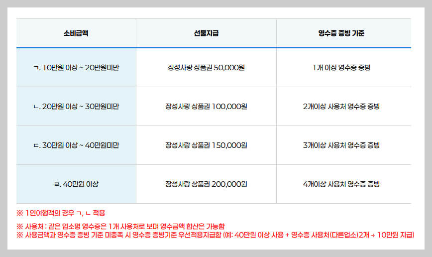 여행 경비의 최대 50%를 '장성사랑상품권'으로 지급해 주는데요. 상품권은 숙박, 식당, 카페 이용까지 장성군 내 등록된 가맹점에서 자유롭게 사용할 수 있어 실질적인 혜택을 누릴 수 있답니다.