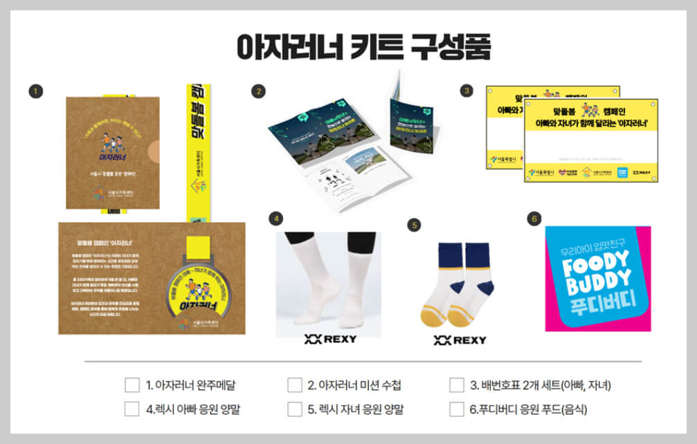 - 아자러너키트 : 완주메달, 배번호, 러닝 양말, 어린이 간식 등