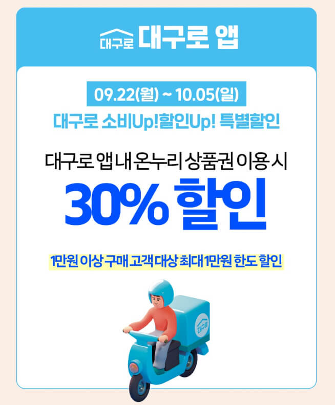 | 대구로 앱 | 30% 할인 | 1만원 이상 구매, 최대 1만원 |
