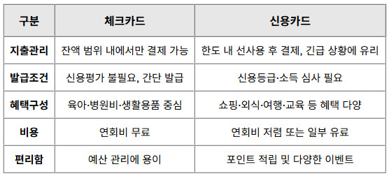 국민행복카드는 체크카드와 신용카드 중 선택할 수 있습니다. 아래 표는 두 유형의 차이를 정리한 것인데요~