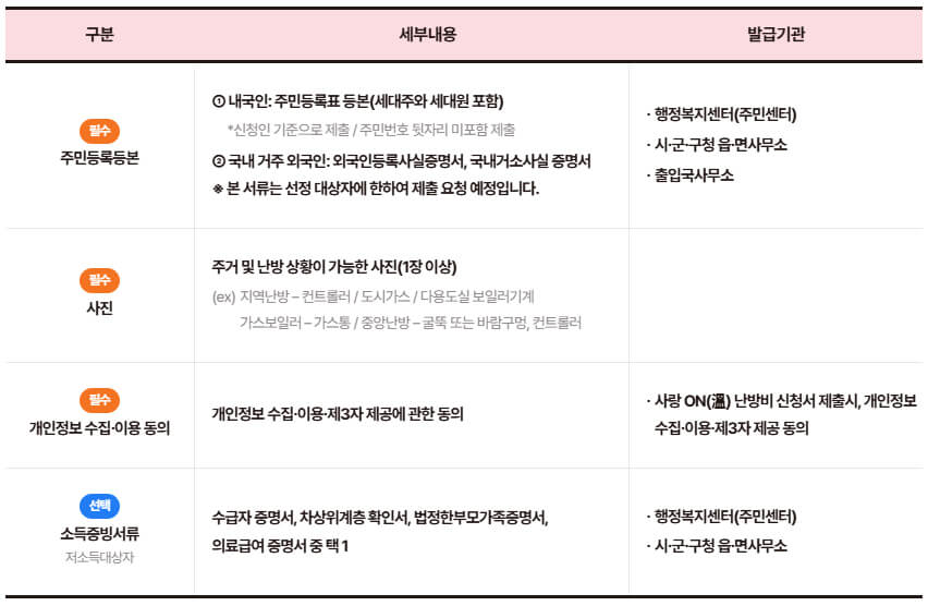- 필수서류 : 주민등록등본 / 주거 및 난방시설 사진 1장 이상 (보일러, 난방기 등) / 개인정보 제공 동의서