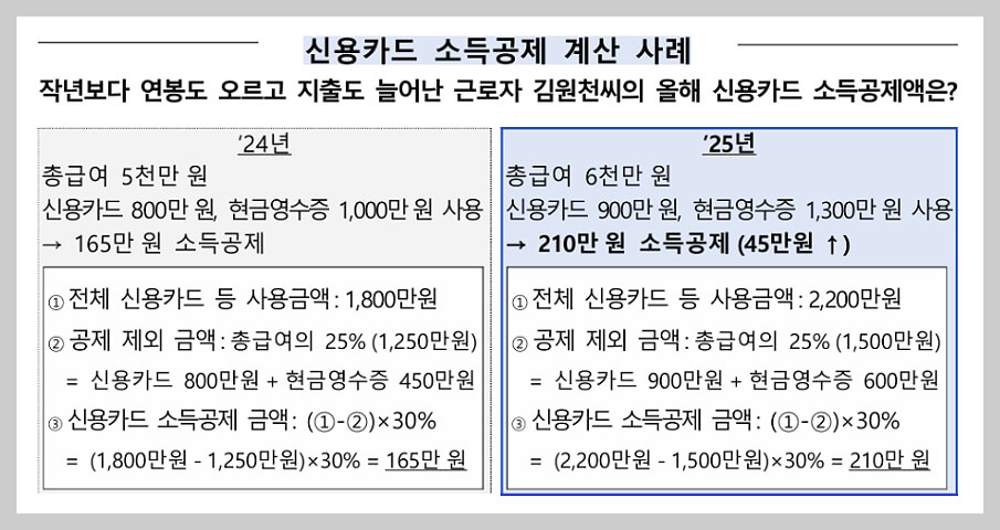 소득공제의 핵심은 '소비수단 선택'입니다. 신용카드보다 체크카드·현금영수증이 공제율이 두 배 높은데요~ 총급여의 25%를 초과한 금액부터 공제가 적용되며, 결제수단에 따라 공제율이 다릅니다.