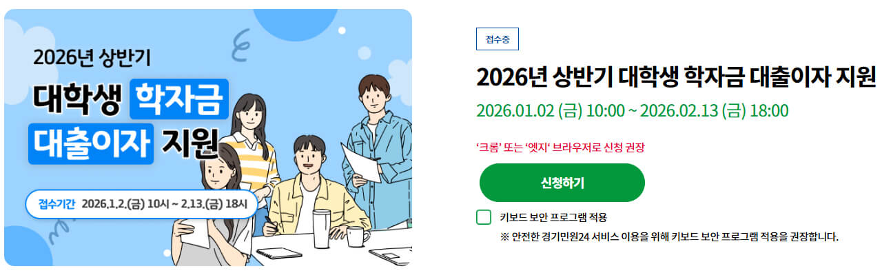 2026 경기도 대학생 학자금 대출이자지원 신청은 경기민원 24에서 온라인으로 신청할 수 있습니다.