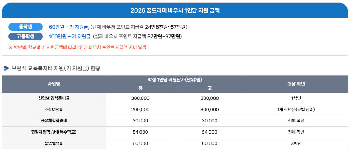 2026년부터 광주 지역 중학생과 고등학생을 대상으로 꿈드리미 카드 바우처 교육지원금이 확대 지급됩니다.