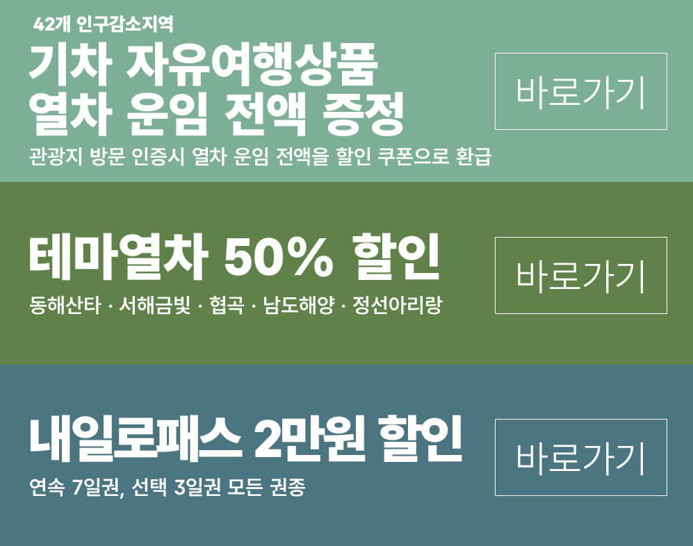 또한 일부 테마열차 및 내일로 패스와 중복 적용이 가능한 경우도 있어, 잘 활용하면 일반 여행 대비 상당한 비용 절약이 가능하답니다.